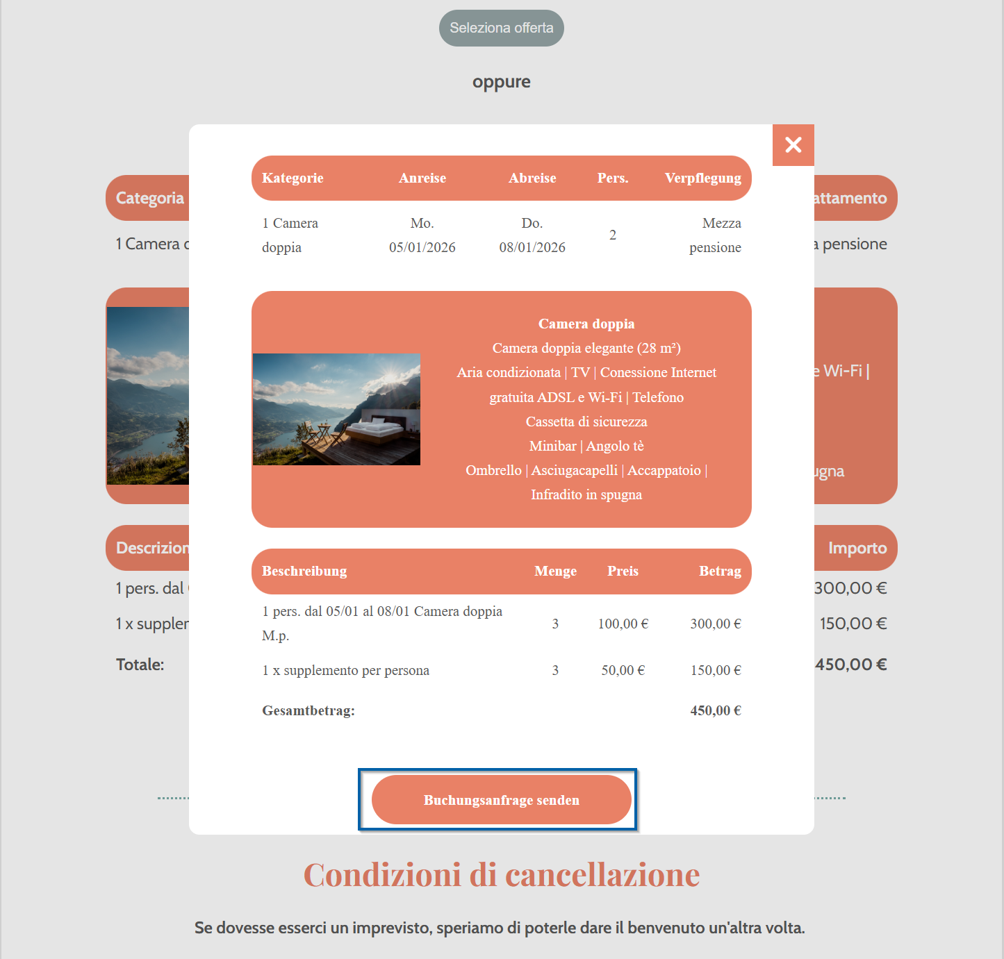Dopo la conferma, la visualizzazione del pulsante dell’offerta selezionata cambia in “Richiesta di prenotazione inviata”.