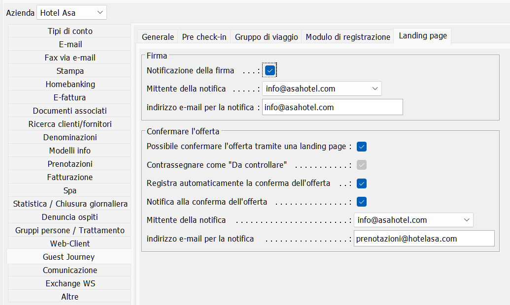 Qui si definisce a quale indirizzo e-mail deve essere inviata la notifica, ad esempio prenotazioni@hotelasa.com