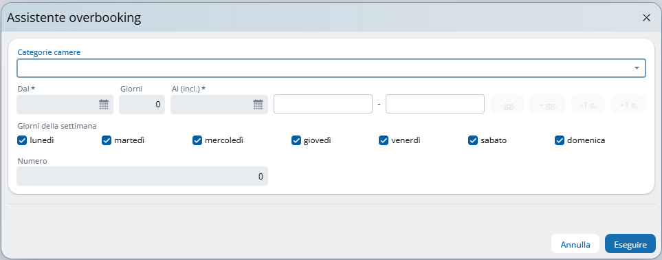 Per ogni categoria di camere e per ogni giorno è consentito inserire esclusivamente un valore compreso tra 0 e 99. Di conseguenza, tramite gli overbooking consentiti, la disponibilità non può essere ridotta, ma solo aumentata.