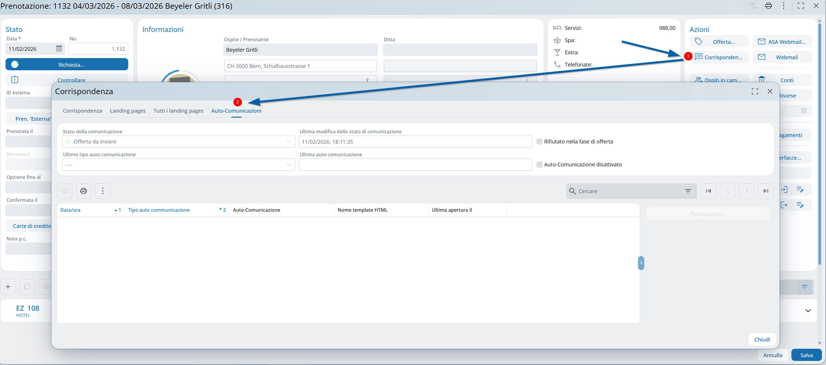 Nel modulo di prenotazione sotto Corrispondenza --> Auto-Comunicazione si trovano i campi rilevanti del Gestore comunicazioni nonché una panoramica tabellare dell’Auto-Comunicazione effettuata.