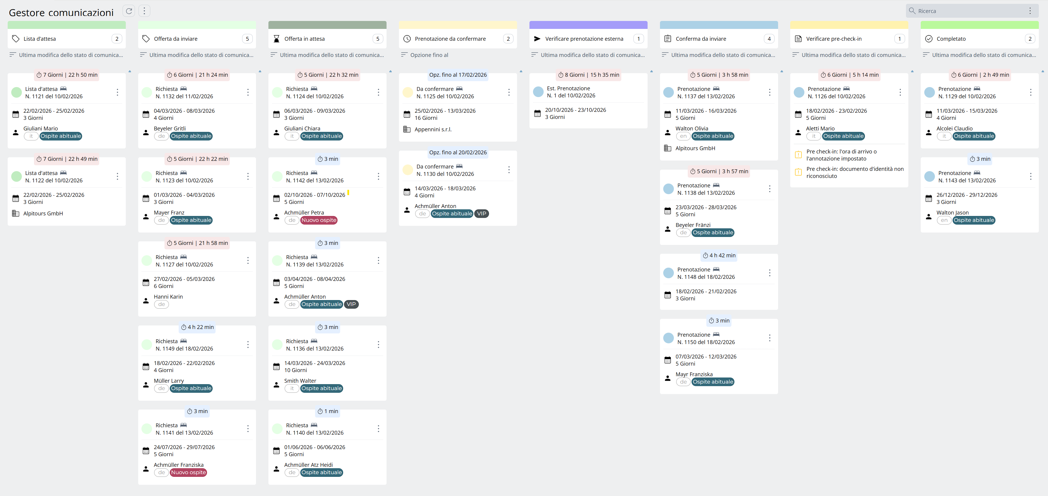 Il gestore comunicazioni è lo strumento centrale della ricenzione per la gestione e la prioritizzazione di tutte le attività di comunicazione relative a richieste, offerte, opzioni, prenotazioni e conferme. Supporta nel mantenere una visione d’insieme, nell’elaborare in modo mirato le attività aperte e nel garantire che gli ospiti ricevano tempestivamente un’offerta o una conferma. Grazie alla vista grafica a bacheca, è sempre possibile vedere in quale fase del processo di comunicazione si trova una prenotazione e da quanto tempo è già aperta lì.