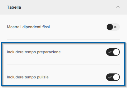 Le impostazioni "Includere tempo di preparazione" e "Includere tempo pulizia" sono state aggiunte nel blocco Spa. In questo modo è possibile stabilire se i tempi tecnici del trattamento debbano essere considerati nella durata visualizzata anche per l'ospite.