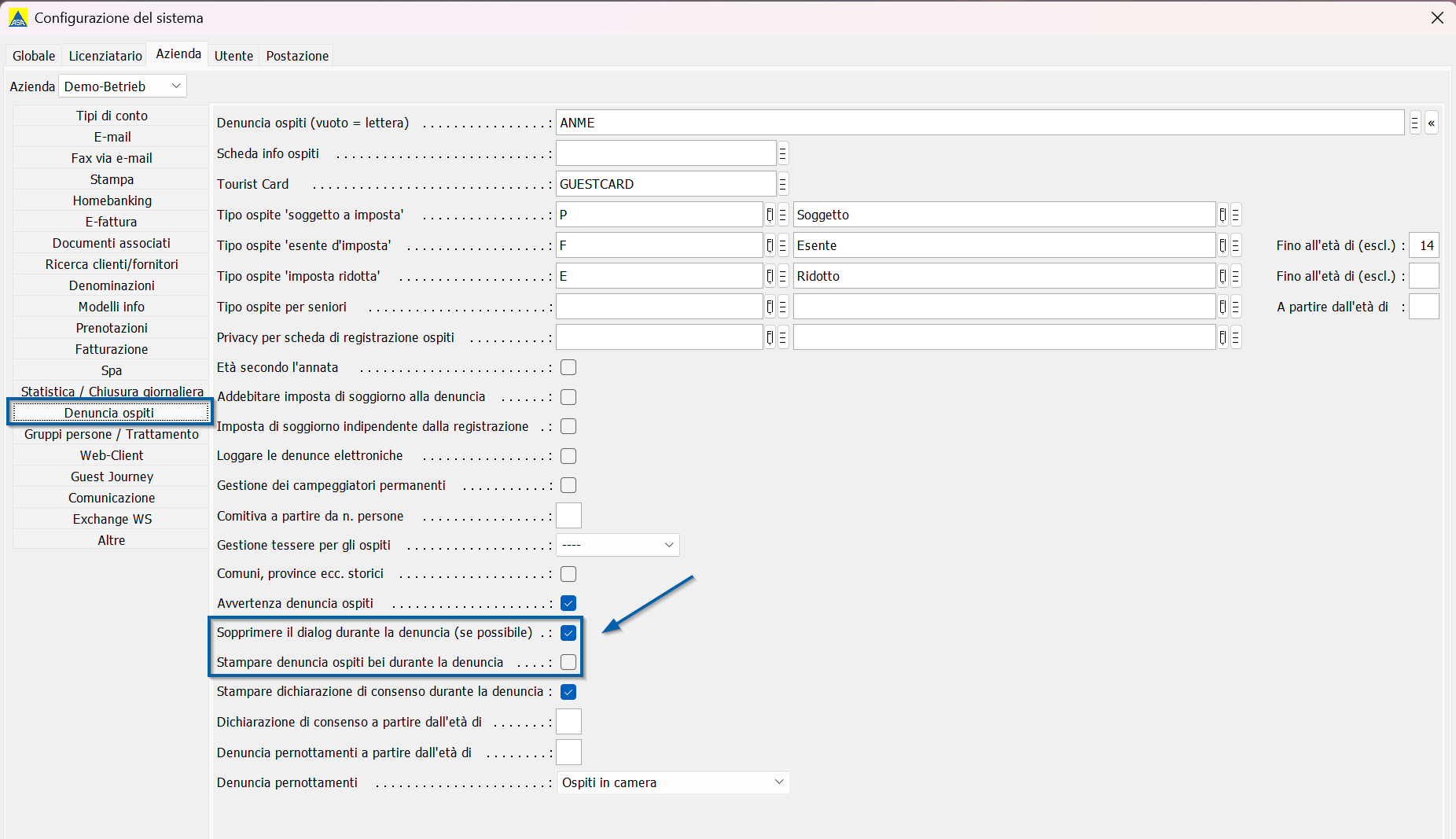 Per accelerare il processo di check-in, nella configurazione di sistema (azienda → denuncia ospiti) sono disponibili due nuove impostazioni: