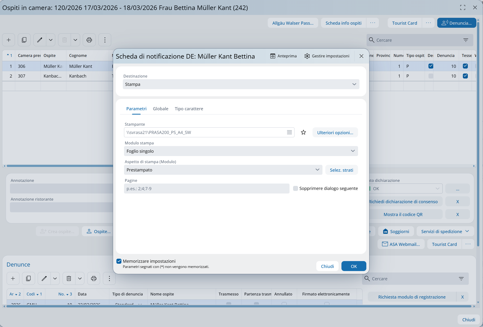 "Stampare denuncia ospiti durante la denuncia": A la denuncia degli ospiti soggetti all’obbligo di registrazione nella prenotazione compare un dialogo stampa, tramite il quale il modulo di registrazione può essere stampato direttamente.