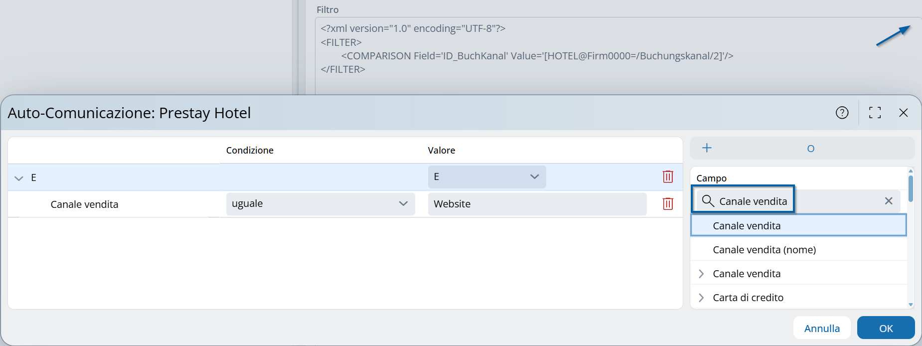 Campo filtro: Canale di prenotazione